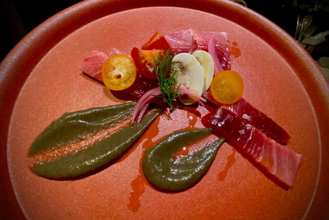 天然鮪カルパッチョ、焼き茄子のクーリ